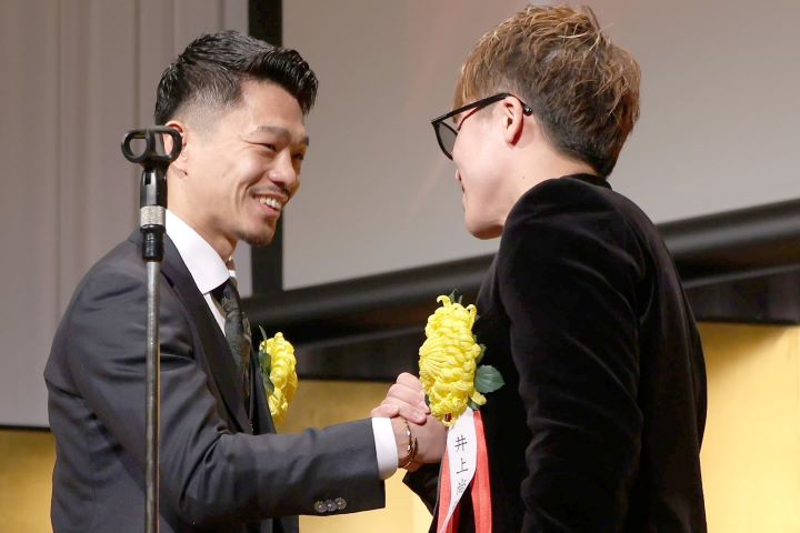 表彰の舞台で、揃い立った中谷に向かって対戦を求めた井上(C)産経新聞社
